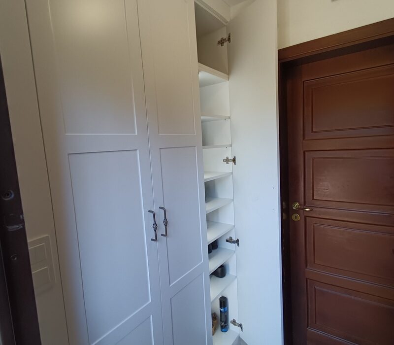 Zabudowa szafy została wykonana na wymiar, dzięki czemu idealnie wpasowała się w dostępną wnękę. Wnętrze zaprojektowano tak, aby pomieściło zarówno odzież wierzchnią, jak i niezbędne akcesoria, zachowując przy tym estetyczny, uporządkowany wygląd.