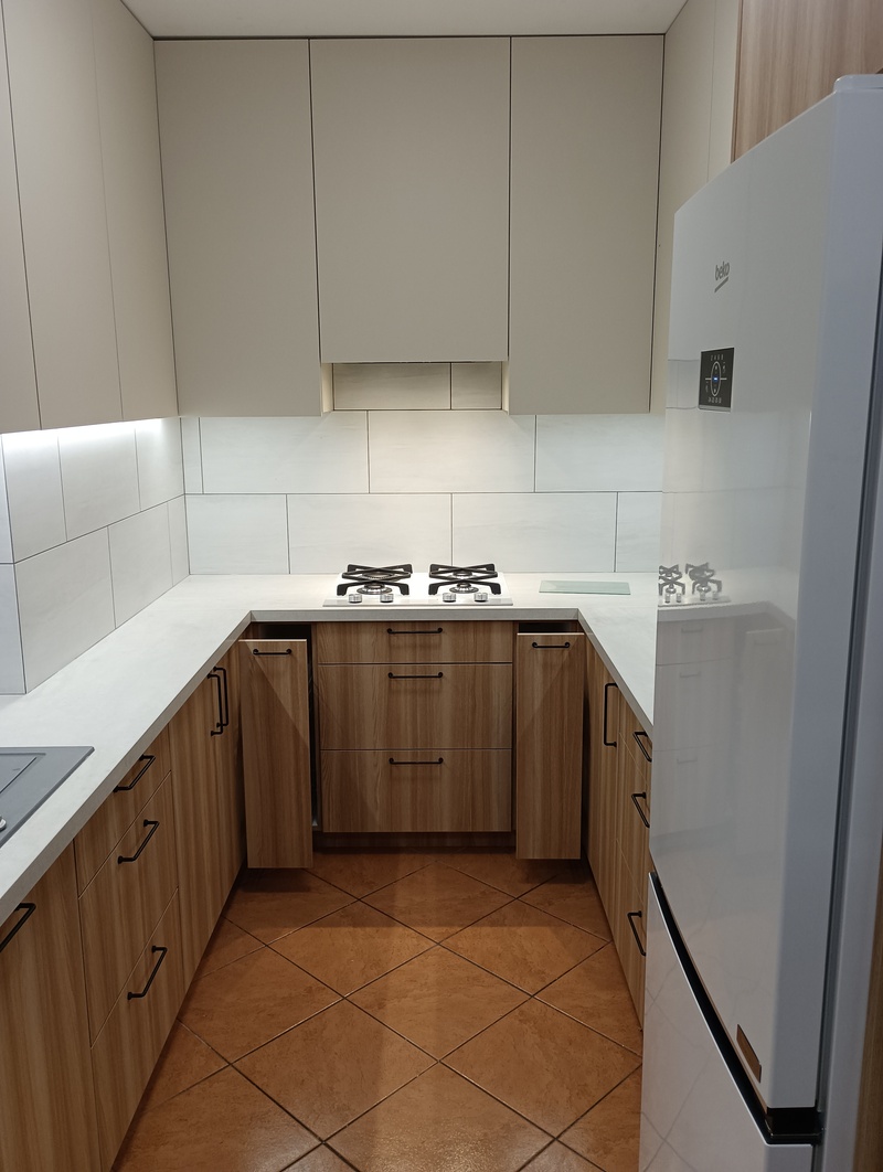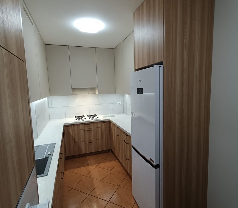 Jednym z wyzwań było dopasowanie mebli do istniejącego układu pomieszczenia oraz zachowanie ergonomii w stosunkowo wąskiej przestrzeni kuchennej. Zaprojektowaliśmy układ w kształcie litery „U”, który pozwolił maksymalnie wykorzystać powierzchnię roboczą i zapewnić odpowiednią ilość miejsca do przechowywania.