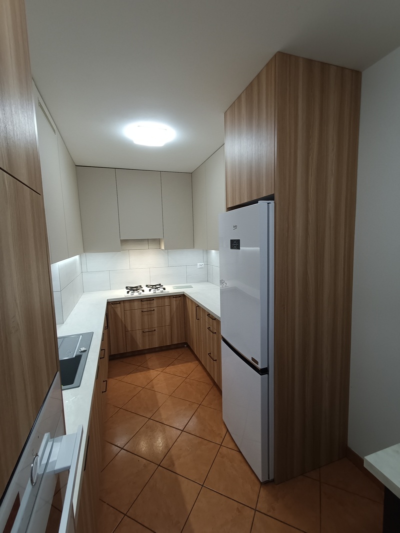 W tej realizacji klientowi zależało na uporządkowaniu przestrzeni oraz stworzeniu funkcjonalnej kuchni, która będzie wygodna w codziennym użytkowaniu. Ważnym elementem projektu była również zabudowa szafy w strefie wejściowej, tak aby maksymalnie wykorzystać dostępne miejsce i zachować estetyczną spójność całego wnętrza.