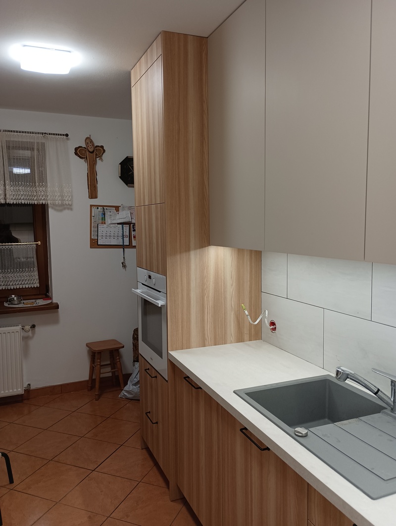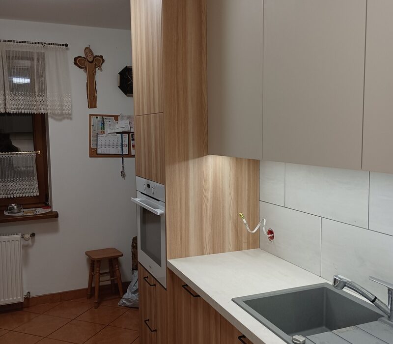 Efektem jest harmonijna i praktyczna przestrzeń, w której kuchnia oraz zabudowa tworzą spójną całość. Klient zyskał funkcjonalne rozwiązanie dopasowane do swoich potrzeb oraz wnętrze, które łączy prostotę z naturalnym charakterem.