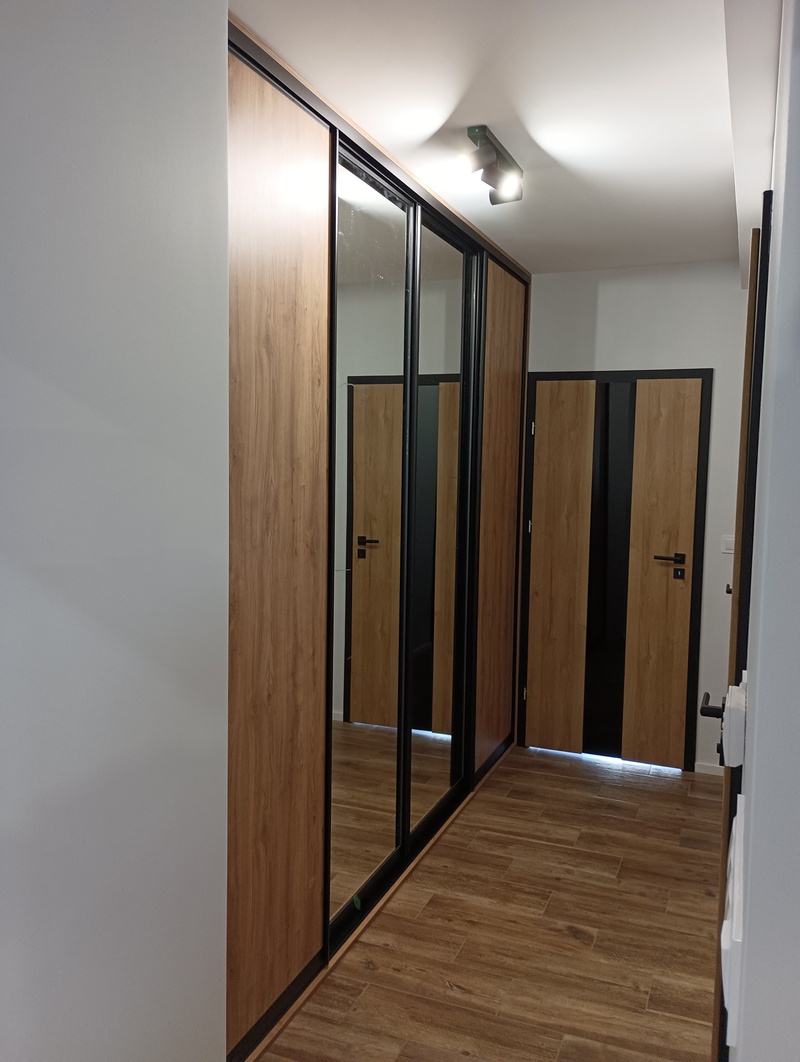 Druga szafa, zlokalizowana w korytarzu, łączy dekor naturalnego drewna z czarnymi elementami konstrukcyjnymi oraz lustrem, które optycznie powiększa i rozjaśnia przestrzeń. System drzwi przesuwnych pozwolił na wygodne użytkowanie nawet w węższym przejściu.