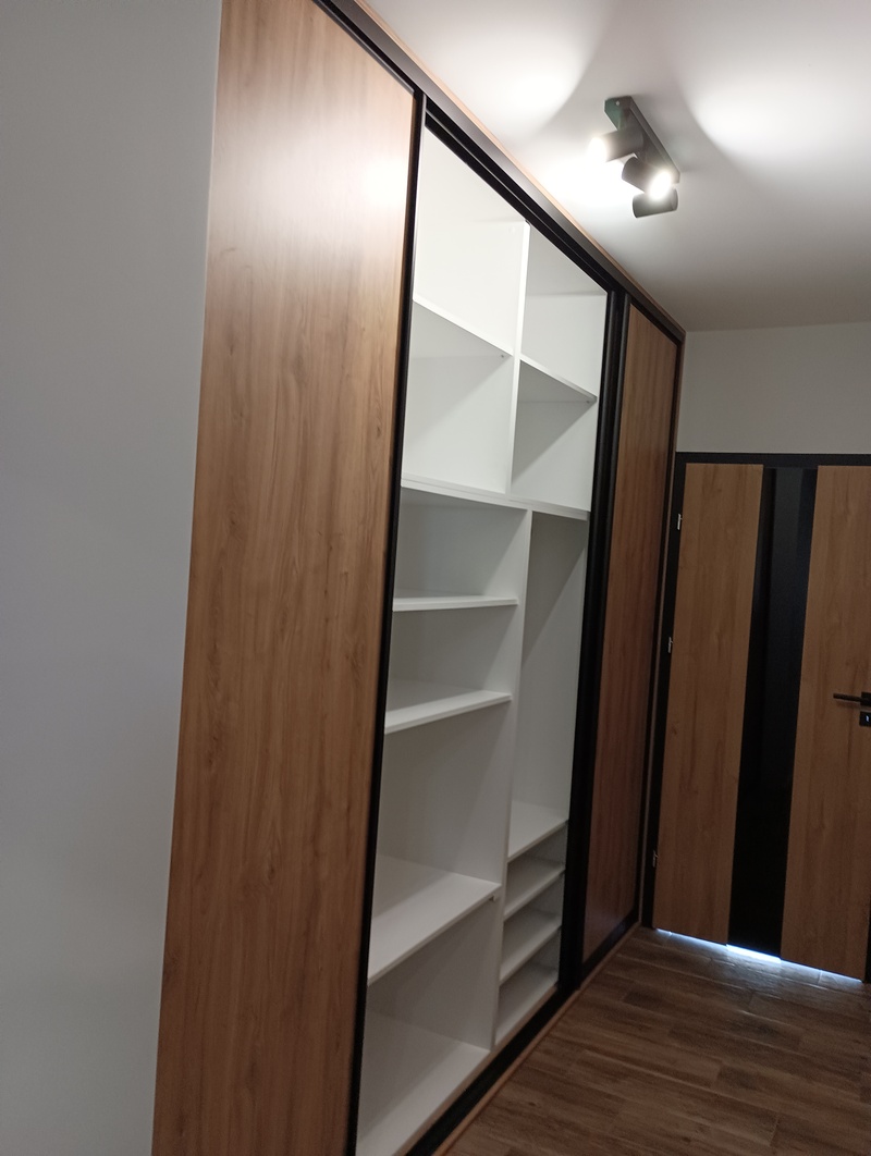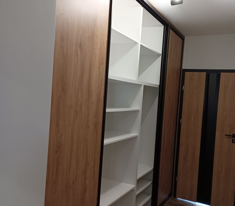 W tej realizacji wykonaliśmy dwie niezależne zabudowy szaf, zaprojektowane tak, aby tworzyły spójną całość stylistyczną w całym mieszkaniu. Klientowi zależało na maksymalnym wykorzystaniu przestrzeni, nowoczesnym wyglądzie oraz dużej funkcjonalności przechowywania.