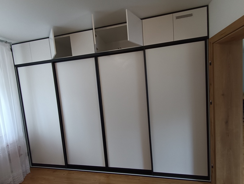 Pierwsza szafa, wykonana w jasnej kolorystyce z czarnymi profilami, została zaprojektowana na całą szerokość ściany wraz z nadstawką do sufitu. Dzięki temu uzyskaliśmy dodatkową przestrzeń do przechowywania, jednocześnie zachowując minimalistyczny charakter zabudowy.