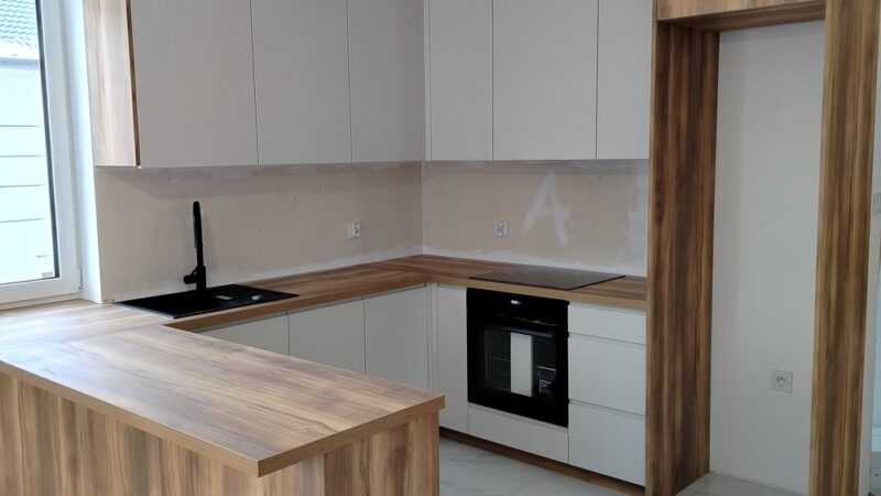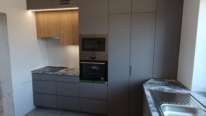W tej realizacji klient zależał na nowoczesnej, funkcjonalnej kuchni, ale nie był pewien, jakie połączenie kolorów i materiałów najlepiej sprawdzi się w jego wnętrzu. Pomogliśmy w doborze odpowiednich rozwiązań, łącząc stonowaną kolorystykę z ciepłym akcentem drewna. Projekt został dopasowany do układu pomieszczenia, tak aby maksymalnie wykorzystać dostępną przestrzeń. Efektem jest spójna, elegancka zabudowa, która łączy estetykę z codzienną wygodą użytkowania.